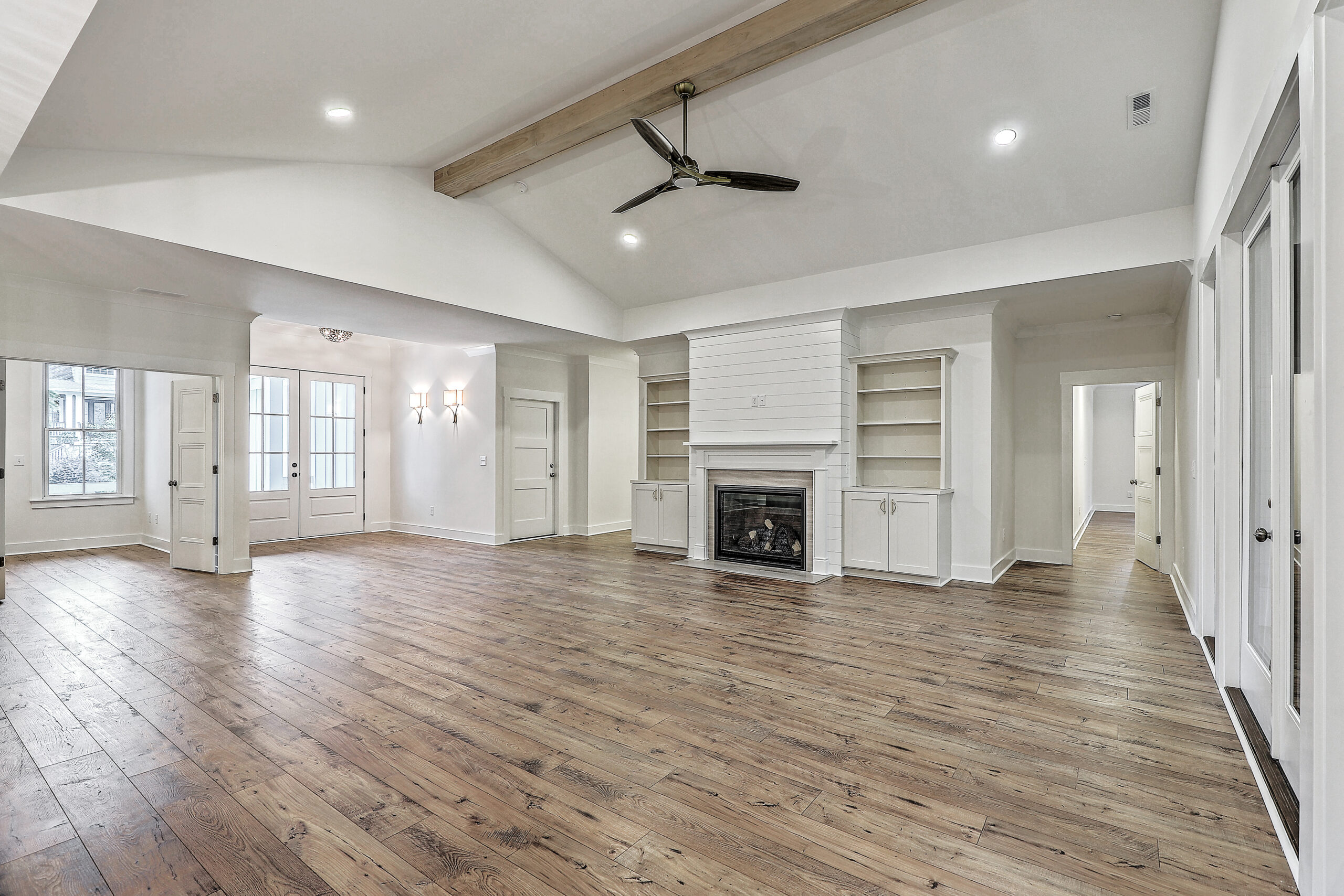 The open-concept living area centers around a custom-built fireplace feature, perfect for cozy evenings or gathering with friends. Every finish has been carefully chosen to balance style and function, from the full tile showers in each bathroom to the handcrafted built-ins in the laundry room.