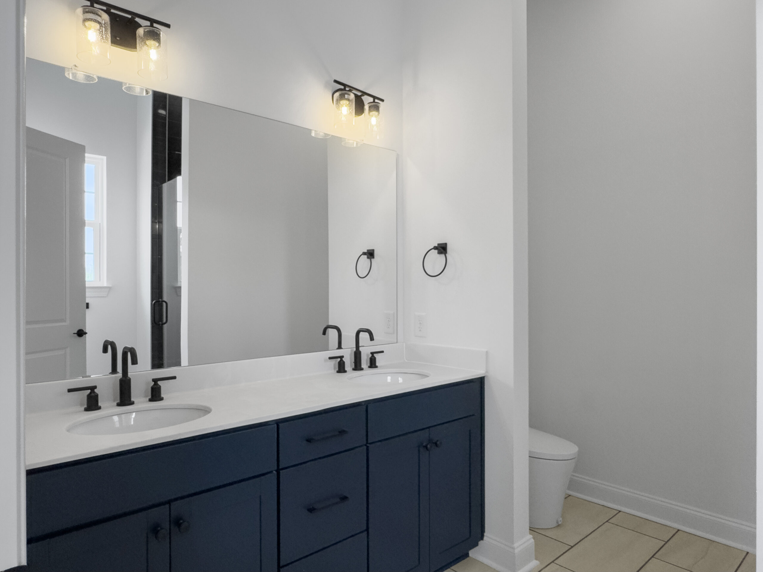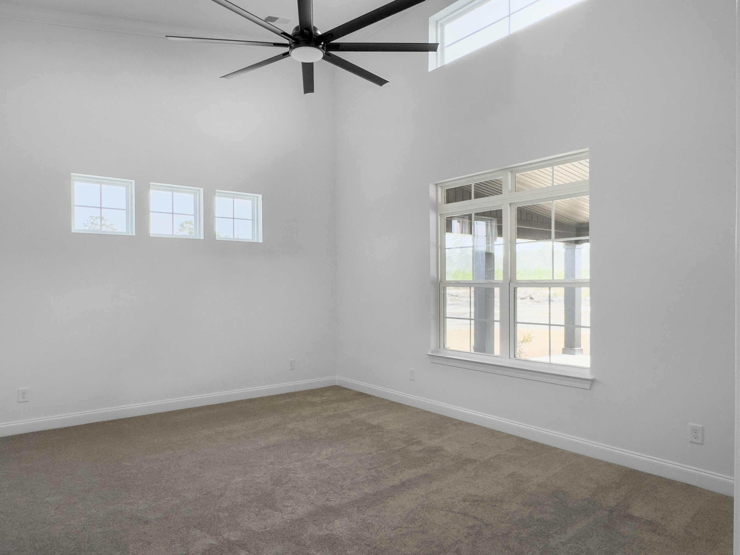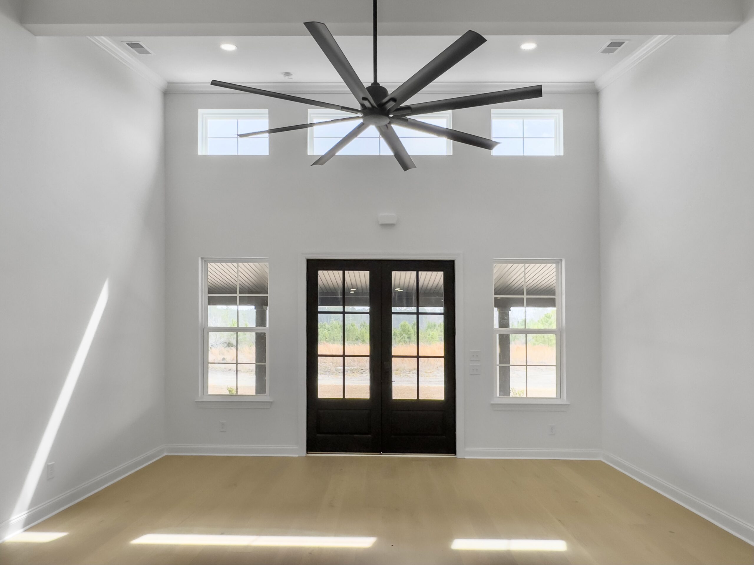 The split floorplan provides privacy and comfort, with a spacious master suite on one side featuring a walk-in closet and a double vanity in the master bath. On the opposite side, two guest bedrooms share a full bathroom, ideal for family or visitors. An oversized mudroom adds practical functionality, while tall ceilings and transom windows fill the home with natural light.